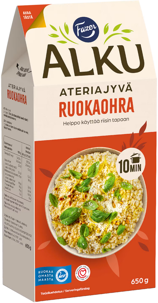 Meal oat is a quick, delicious, and high-fibre side dish you can use just like rice for any meal of the day. Try it in an oat risotto, as a filling for pies or salad topping! This product is made from Finnish grain at Fazer’s mill in Lahti. Give your day a good start with Alku!